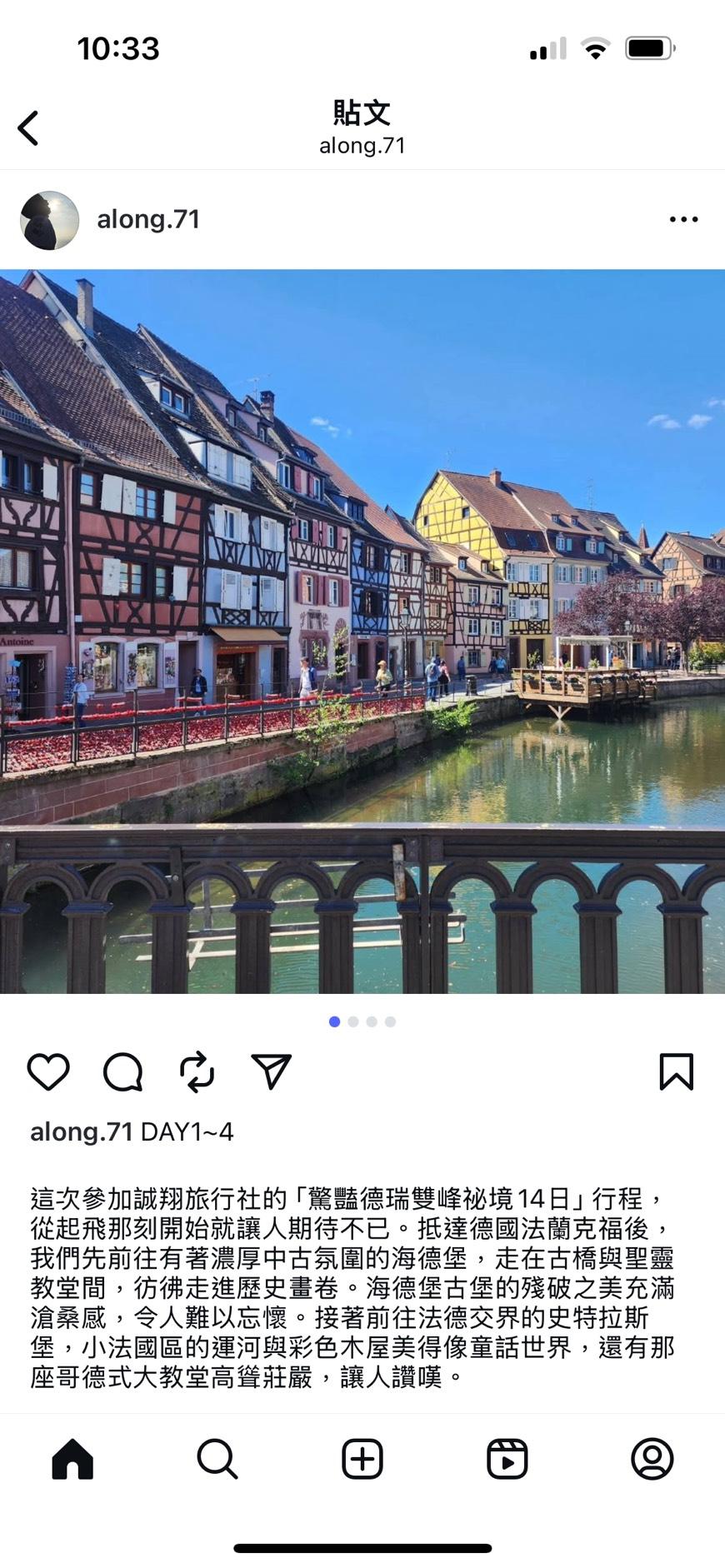 這次的德瑞行程,不僅讓我一覽少女峰與馬特洪峰的壯麗風光,更深入體驗德瑞古城、湖泊與山區的迷人魅力。行程的規劃、餐食安排到住宿品質都超出預期,還有專業的導遊CC,司機大哥、一群很棒的團友,讓整趟旅程充滿溫暖且安心,非常值得,心底也留下了深刻美好的回憶。 https://www.instagram.com/p/DLfPA__SDVn/?img_index=1 https://www.instagram.com/p/DLfOyI0yMGN/?img_index=1 https://www.instagram.com/p/DLfN9IfSv8p/?img_index=1