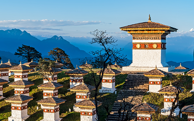 這裡共有108座佛塔,是不丹境內觀賞喜馬拉雅山脈的最佳地點。白色佛塔群間以古樸的石梯相間,是不丹皇室及高僧的避寒勝地,這裡有層層疊疊的梯田,詩如畫的山林景色,依著山谷的地形呈現,山谷間點綴著如藍色彩帶般的清澈溪流,有如人間仙境。
