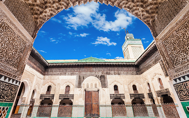 在菲斯最精美的建築就是布伊納尼亞神學院,還是菲斯唯一一座設有開放給公開朝拜清真寺的神學院。外觀鑲滿精緻綠色馬賽克圖案的清真寺尖塔,中央庭院由大理石鋪面,繁瑣的石刻和木雕於四周隨處可見,細節處無不彰顯華美和諧。該學院對非宗教人士開放。