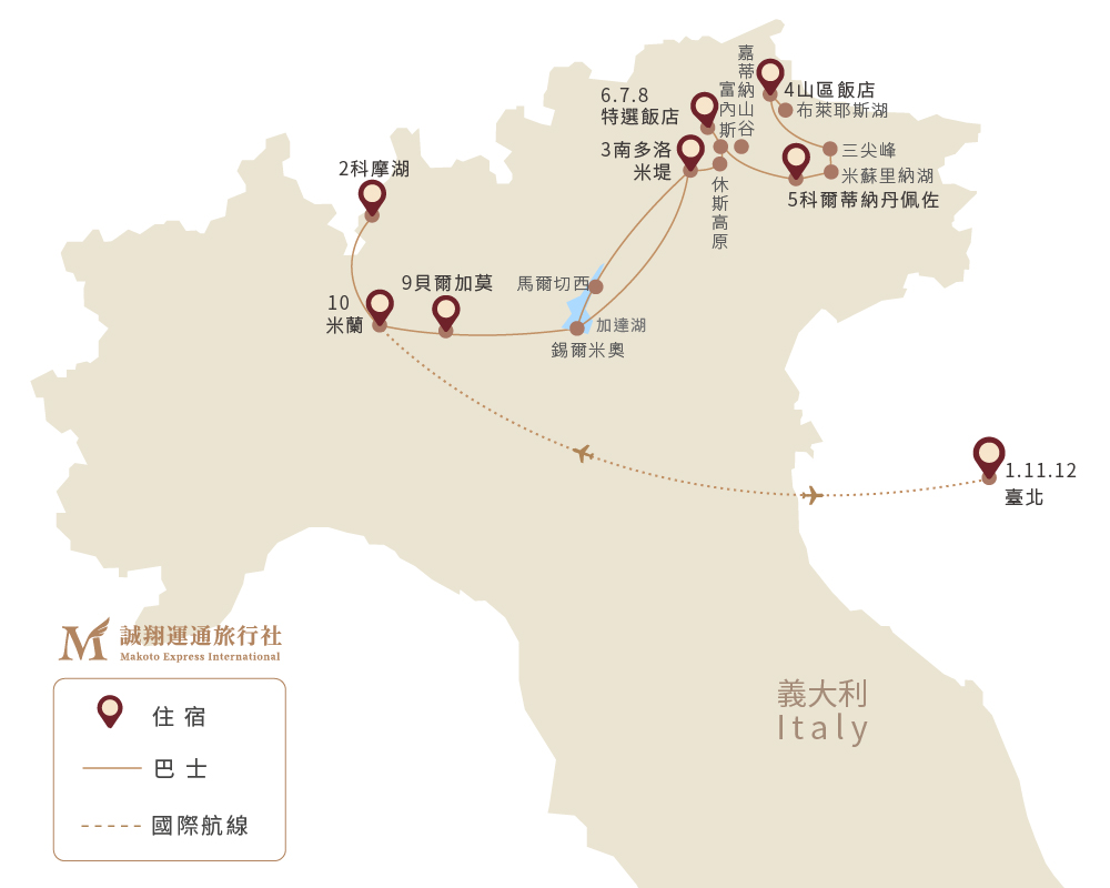 國泰航空米蘭進出(或可機票自理改搭長榮);西多洛米堤的刀峰山、休斯高原、富內斯山谷;北多洛米堤的藝術秘境:山脈攝影美術館+山岳博物館、布萊耶斯藍湖;東多洛米堤的米蘇里娜湖、三尖峰、最美大白雲巖公路、藍科弗爾山環遊;北義阿爾卑斯雙湖區的科摩湖+貝拉喬、加達湖+巴爾多山旋轉纜車;在地風味美食如龍蝦麵、香烤豬腳、義式烤牛、米其林推薦、三星米其林 多洛米堤特選五星飯店連泊三晚