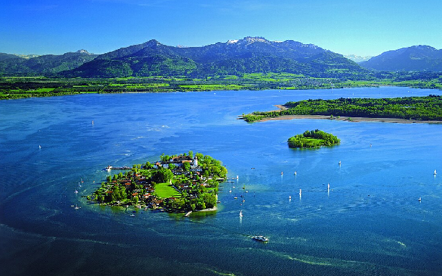 德國巴伐利亞州最大的湖泊,又被稱為「巴伐利亞海」。湖中有著名的海倫基姆島,島上矗立著仿凡爾賽宮建造的海倫基姆宮。周圍群山環繞,湖水清澈,是健行、騎行與乘船觀光的熱門地點。