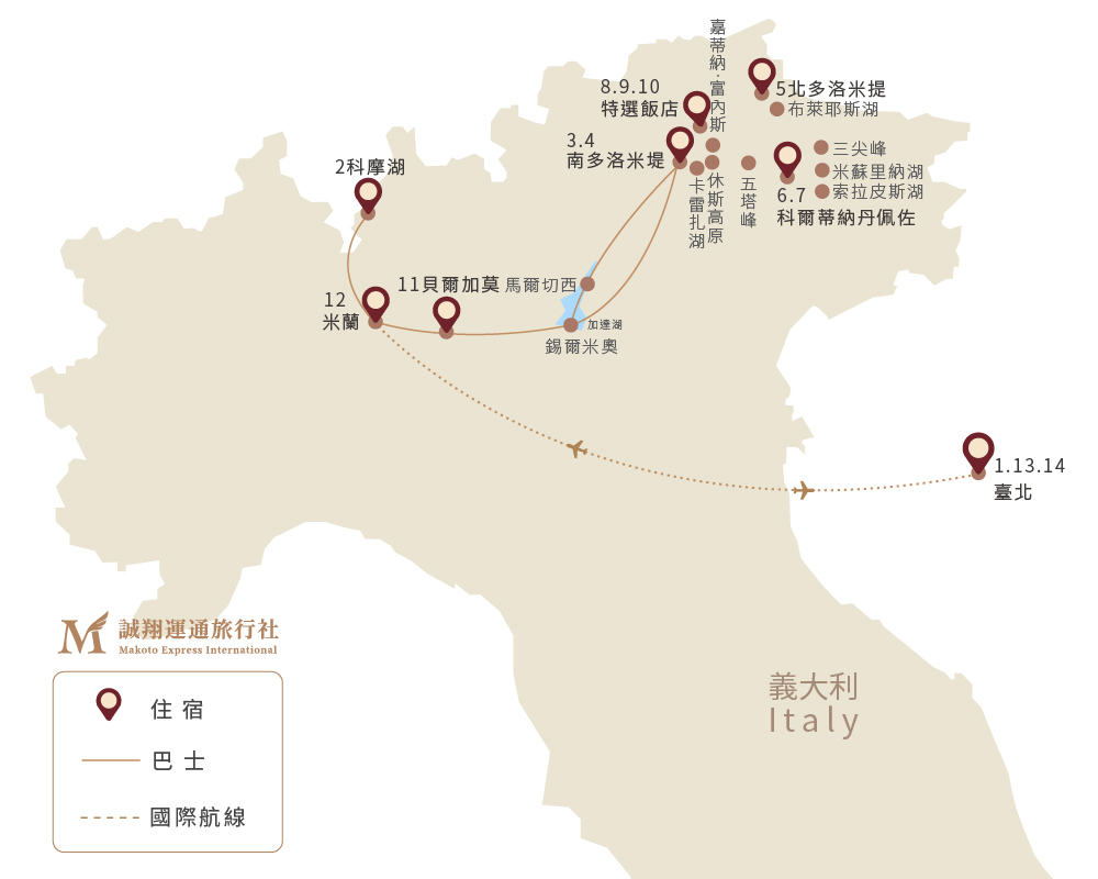 國泰航空米蘭進出(或可機票自理改搭長榮);西多洛米堤的刀峰山、休斯高原、富內斯山谷;北多洛米堤的藝術秘境:山脈攝影美術館+山岳博物館、布萊耶斯藍湖;東多洛米堤的米蘇里娜湖、三尖峰、索拉皮斯湖、五塔峰、最美大白雲巖公路、藍科弗爾山環遊;北義阿爾卑斯雙湖區的科摩湖+貝拉喬、加達湖+巴爾多山旋轉纜車;不含健行午餐,飯店精緻晚餐、米其林推薦、三星米其林饗宴 多洛米堤特選五星飯店三晚