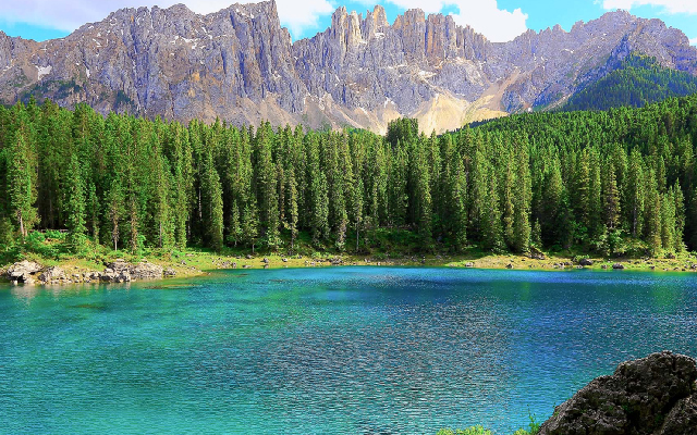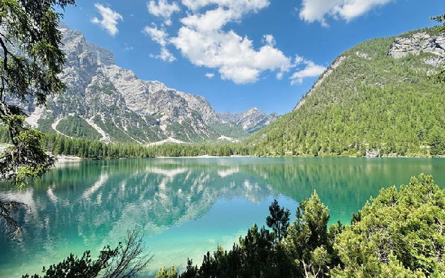 位於義大利北部多洛米堤山區,被譽為「彩虹湖」,以其迷人的湖水色彩和壯麗的周圍山景而著稱。湖水在陽光下呈現出不同層次的翡翠綠和藍色,宛如寶石,四周環繞著鬱鬱蔥蔥的森林與拉特瑪山。傳說這片湖泊是巫師和美人魚故事的背景地,為其增添了一份神秘色彩。