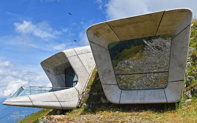 由ZahaHadid建築師事務操刀的MMMCorones,混凝土澆灌而成的博物館,嵌入海拔2275公尺的山之巔,由以曼妙的線條從岩石間探出頭來,山體中的博物館彷彿洞穴體驗,開放式陽台,親自感受群山簇擁中俯瞰齊勒河谷山巒壯麗綿延的動人景色。