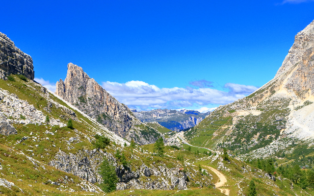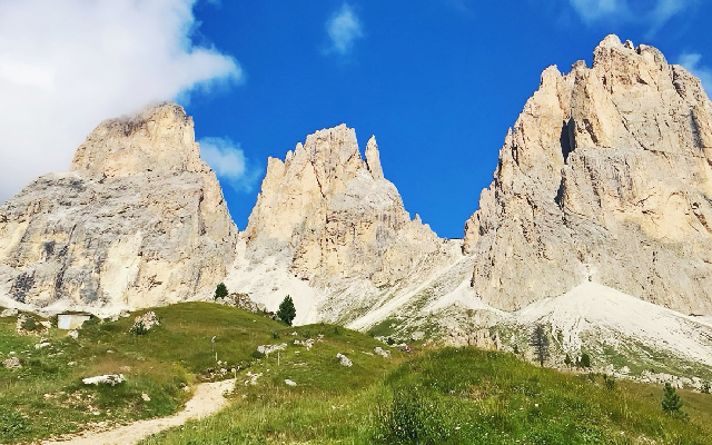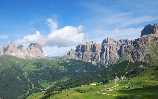 挺拔的山群像一面巨大的屏風,堪稱多洛米堤最氣勢磅礡、最劇力萬鈞的山群。PizesDeCir山群線優美的髮夾彎散落,大名鼎鼎的Sassolungo山,略呈等腰梯形的特殊山型,行經四大隘口之一的PassoGardena時,壯闊山勢都能盡收眼底。