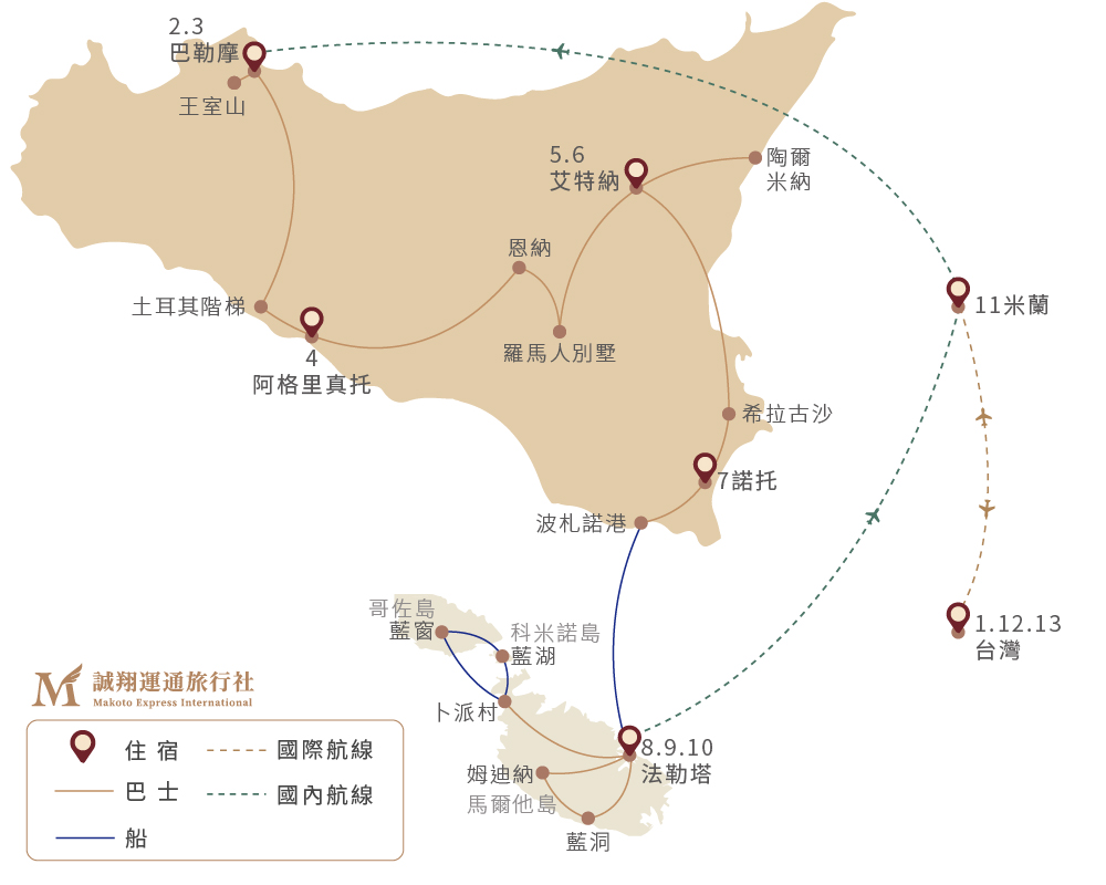 長榮直飛+兩段內陸段飛機快速連結、希臘+羅馬千年文化遺址:阿格里真托希臘神殿+羅馬人別墅馬賽克藝術+陶爾米納希臘劇場、巴洛克城市建築美學希拉古沙、奇特大自然體驗:艾特納活火山大腳車+健行、馬爾他雙島巡禮:哥佐島+科米諾島、三藍傳說:藍湖+藍洞+藍窗、三大城市舒適連泊:巴勒摩2晚+艾特納2晚+馬爾他3晚、在地風味美食、1+2星米其林饗宴