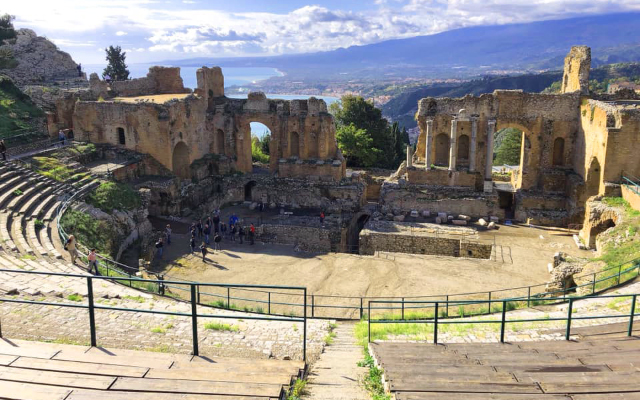 希臘劇場為羅馬人於西元前二世紀所建,是西西里島上第二大的古代劇場。位置坐落於城中最高點的懸崖上,由於地勢高視野開闊,不僅能欣賞湛藍海面,天氣好時更可遠眺埃特納火山。歷經年代久遠部分磚造圍牆倒塌,但暴露空間卻給劇場增添更與眾不同的美麗風景。