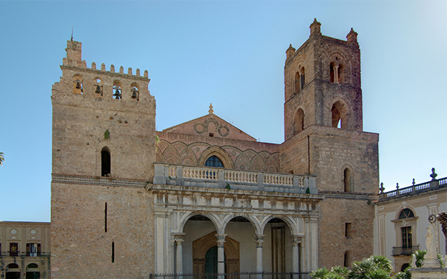 西西里島首府巴雷摩宏偉的諾曼名勝王室山,蒙雷阿萊大教堂是當今現存世界上最傑出的諾曼式建築之一,欣賞西西里和拜占庭藝術家,精雕細琢金光閃閃的馬賽克鑲嵌畫,由諾曼國王威廉二世,為了和巴勒摩大主教勢力抗衡所建。