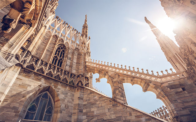 歐洲第三大的米蘭大教堂,從始建到建成共花費六個世紀,整體建築風格融合古典與哥德式,也是世界最大哥德式建築經典。外觀由白色大理石砌成,上半部為哥德式尖塔,共計135座。下半部為典型巴洛克式,從上而下佈滿精美雕塑,是文藝復興時期具代表性的建築。