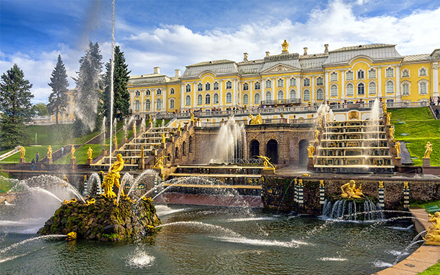 擁有俄羅斯凡爾賽的美譽,搭乘水翼船前往夏宮大殿是皇家宅邸,內外裝飾有巴洛克、洛可可及古典主義風格,反應歷史和裝飾藝術不同的發展階段。下花園布局獨具一格,筆直的林蔭大道,修剪整齊的灌木叢,金飾的噴泉群、豪華的人工石雕,把花園裝飾的美妙無比。