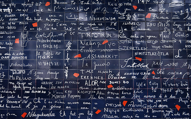 被浪漫包裹的巴黎,有個在巴黎旅遊串場的景點-位於蒙馬特半山腰的愛牆,出自於兩位藝術家的構想,在40平方公尺的牆上鋪上了612塊寶藍色磁磚,用250個語言寫上311個「我愛你」,西元2001年2月14日情人節當天建立,以開放式的空間自由參觀。