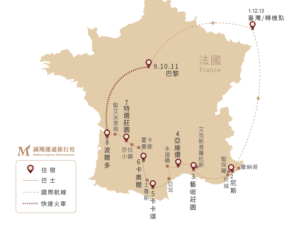 阿聯酋、尼斯進巴黎出、不走回頭路、TGV子彈列車連接南北最輕鬆 普羅旺斯藝術莊園名家建築藝術、山居歲月普羅旺斯、蔚藍海岸與時尚摩納哥、古城卡卡頌、多敦聶河谷、波爾多葡萄酒鄉,全程美味法式料理、二星米其林饗宴、LE7葡萄酒博物館景觀餐廳、藍火車餐廳、巴黎鐵塔景觀餐廳、塞納河遊船晚宴、巴黎文華東方奢華連泊三晚