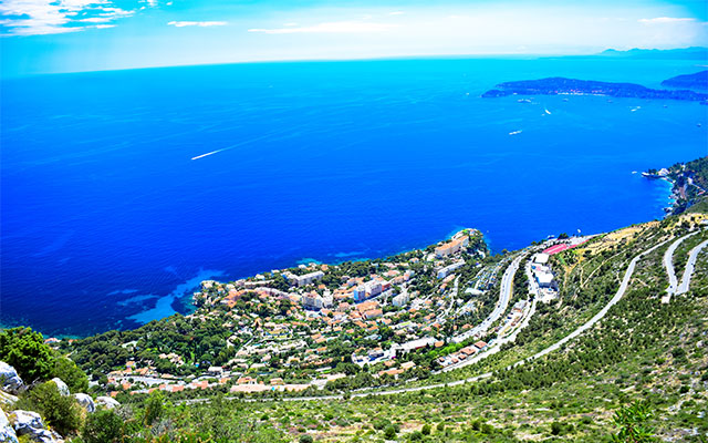 蔚藍海岸道路,千仞的山崖陡壁筆直的插入雲宵,其下的地中海風平浪靜,半腰間的公路如一道凹刻的長線與海岸線一路蜿蜒伸展,山綠、海藍、屋美、天青景緻美麗的讓人屏息。