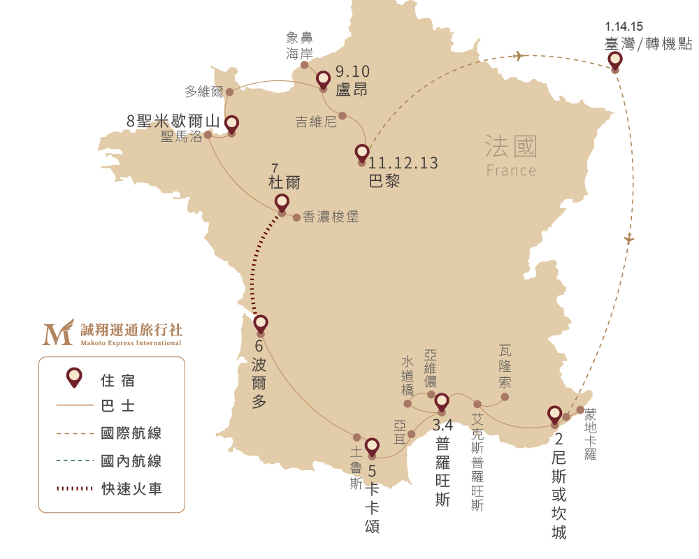 阿聯酋尼斯、巴黎雙點進出+一段快速火車、優雅旅行、悠閒蔚藍海岸、靜謐普羅旺斯山城、中世紀城堡回味、美食小鎮探奇、葡萄酒鄉巡禮、羅亞爾河城堡之旅、法國名勝聖米歇爾山、北法印象畫派之路、莫內花園、四星優選+普羅旺斯特色莊園連泊+諾曼地古城連泊+巴黎五星三晚、全程法式特色美食、塞納河遊船晚宴&巴黎鐵塔景觀餐廳、一星米其林饗宴