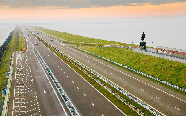 大堤由荷蘭著名水利工程師設計,全長32公里,是世界上最長的防洪堤防。它的建成在相當程度上解決了困擾荷蘭幾代人的嚴重水患,實現了將兩省連接的夢想。站在觀景台俯瞰兩側平靜的海水與湖水,遠眺無邊際的跨海大堤,心中充滿無限讚嘆。