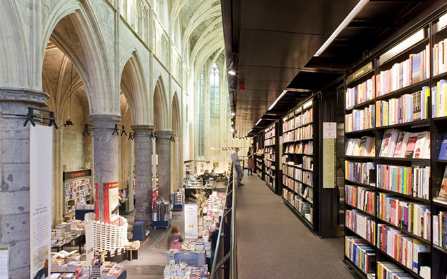 被英國衛報評選為世界最美書店,位於13世紀哥德式教堂內,門設計成書本形狀,開店時如同展開一頁書篇,關店時則將書本闔上;原祭壇則成了咖啡店座位區,半圓形空間搭配中央十字型餐桌,在這啜飲一口莊嚴的氣氛,細細品味這歷史建物的壁畫雕刻。