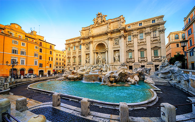 羅馬最大的巴洛克風格噴泉,高25.6公尺、寬19.8公尺,隱身在市區巷弄間。傳說只要向池中投下一枚錢幣,便能再次重返羅馬;投下兩枚,將邂逅一段新戀情。這裡也是經典電影《羅馬假期》的拍攝地之一,浪漫氣氛令無數旅人駐足流連。