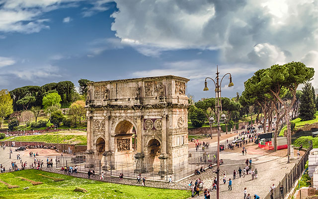 坐落於羅馬競技場與帕拉蒂尼山間,是為紀念君士坦丁一世於312年米爾維安大橋戰役中獲勝而建。三拱門設計莊嚴大氣,門身裝飾融合來自更古老建築的浮雕與構件,呈現出羅馬帝國晚期的建築風格。作為羅馬現存最新的一座凱旋門,是見證歷史的重要地標之一。