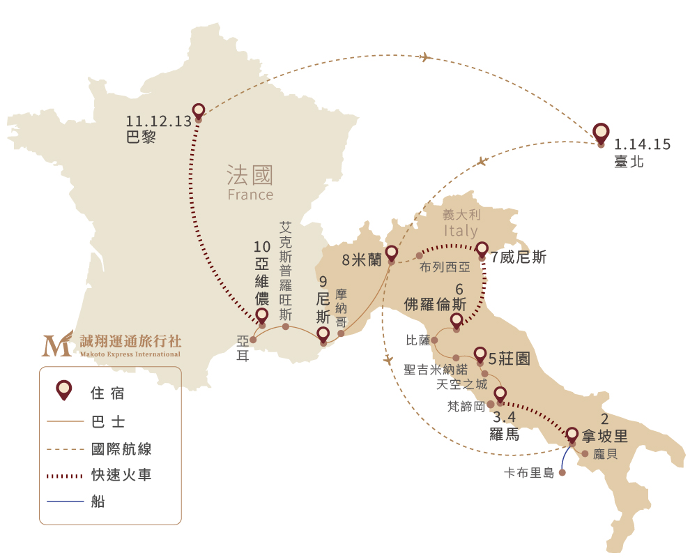 長榮直飛雙點進出,回程托運行李23公斤兩件+一段國內班機+四段快速火車、義大利四大名城、羅馬深度導覽:梵諦岡博物館、競技場、愛情之都維諾納、浪漫卡布里島藍洞、天空之城秘境、法國蔚藍海岸、奢華小國摩納哥、普羅旺斯、巴黎羅浮宮+凡爾賽宮、塞納河遊船晚宴、巴黎鐵塔景觀餐廳、四大主題住宿:羅馬連泊、佛羅倫斯古城、威尼斯島、巴黎三晚五星