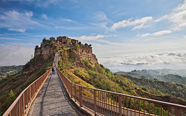 創建於2500年前的伊特魯里亞古村,孤立於山丘之巔,四周地基因風化與崩落逐漸流失,形成與世隔絕的奇景。村落居民已多數遷出,唯餘少數人家與歷史建物堅守原地。偶爾雲霧繚繞,如夢似幻,被譽為現實中的「天空之城」,猶如走入宮崎駿動畫中的異想世界。