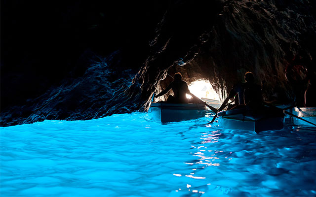 藍洞是世界聞名的天然海蝕奇景,陽光經由洞口折射,使洞內海水閃耀出宛如寶石般的湛藍光芒,夢幻迷人。需由船夫操縱小艇,於退潮時仰躺穿過狹窄入口方能入內,體驗大自然的神奇魔力。若因天候或海象不佳無法入洞,將改為卡布里島鎮上觀光,恕不另行退費。