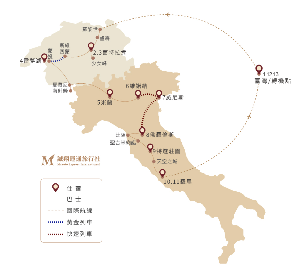 阿聯酋航空北進南出、快速火車體驗、瑞士美湖、優雅旅行 瑞士雙名峰:阿爾卑斯山第一高峰白朗峰+歐洲屋脊少女峰 三大鐵道:瑞士黃金列車最美路線、義大利國鐵、法拉利快車 兩大主題連泊、瑞義雙國在地美食+三星米其林饗宴